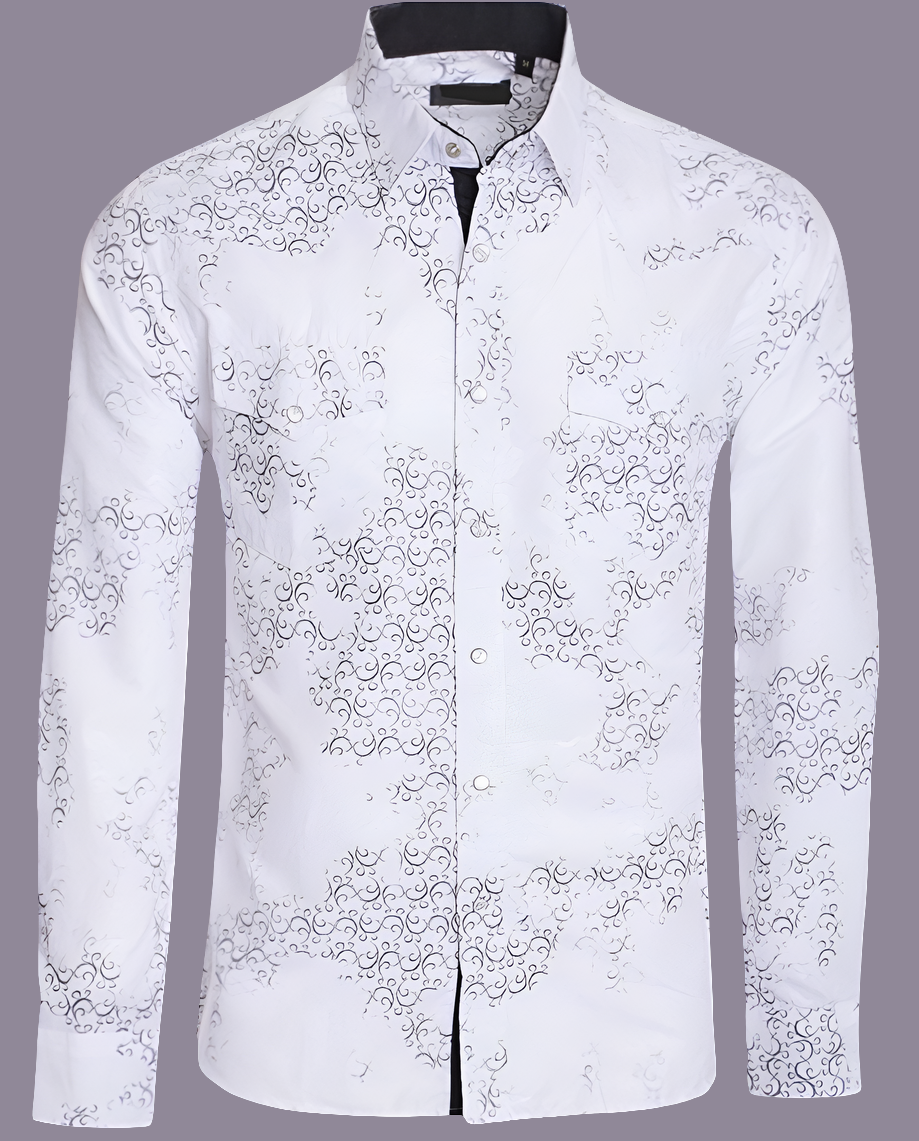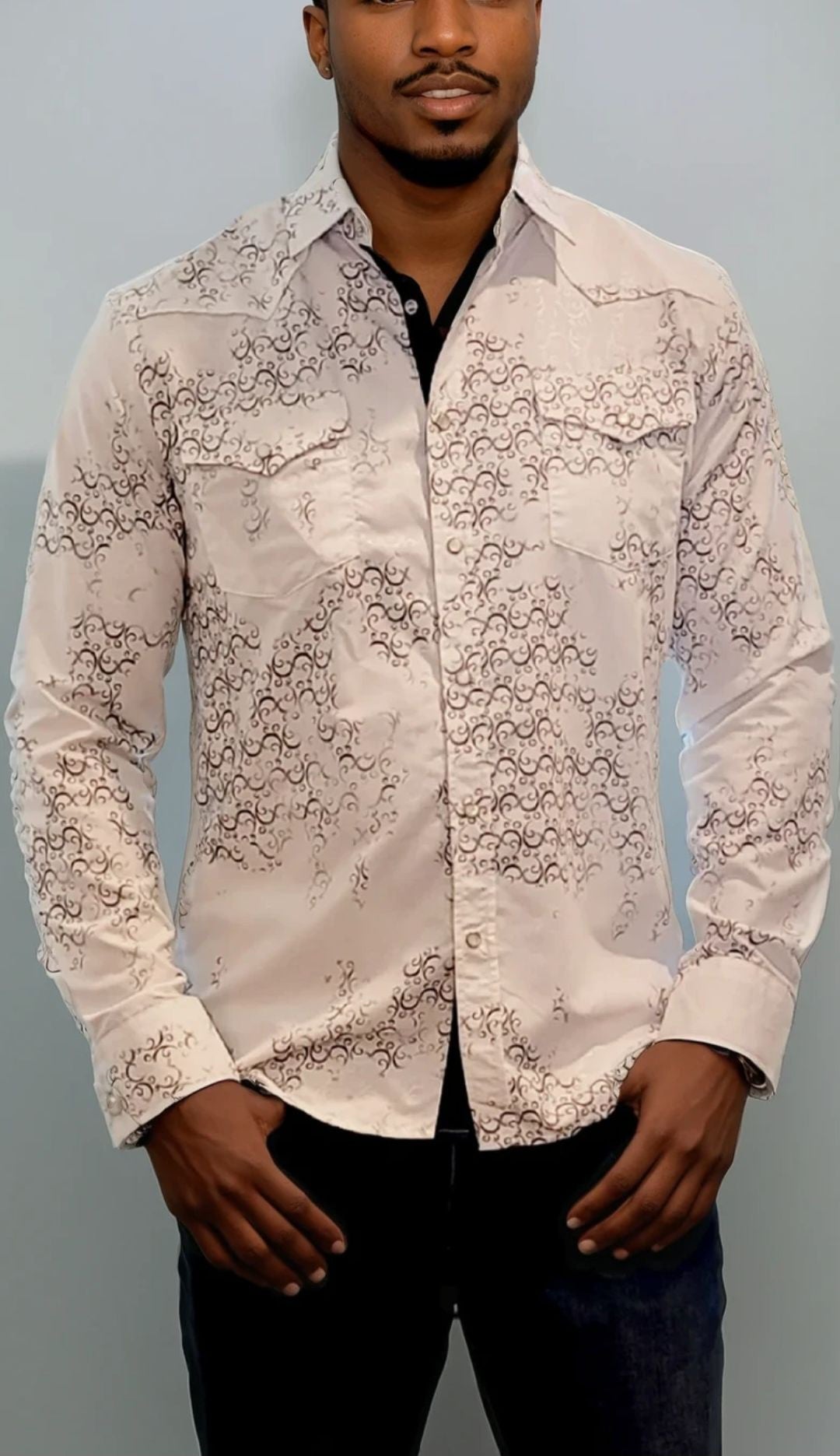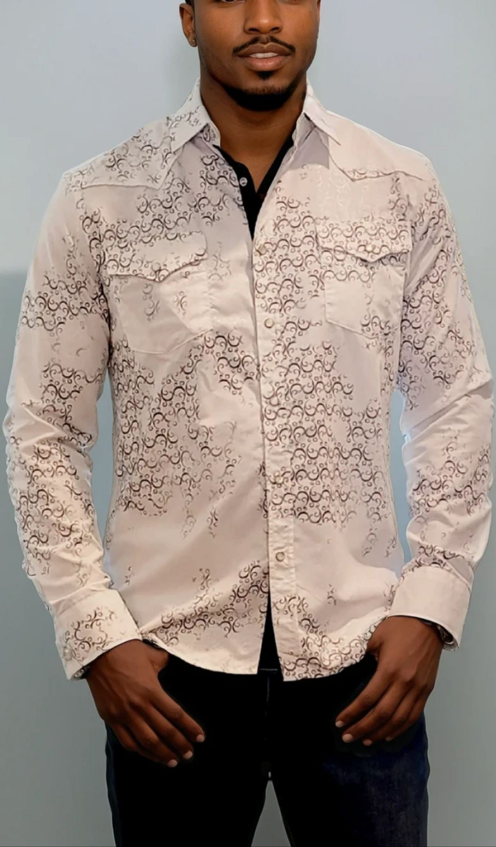 This is no ordinary shirt. Very comfortable and durable material. The uniquely fresh and classic snap button-down cotton blend shirt. Has gray/black/ smokey light slightly reflective pattern design on it. Stylish and comfortable the look works well dressed up or down with jeans, khakis ,or a dress-slack smooth look.