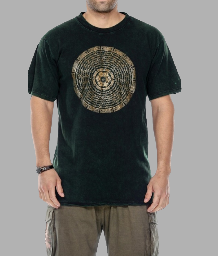 High quality, extra durable & comfortably soft tee shirt with a gold print inscription Om Mane Mandala design. Dark green color has very slightly two toned vintage affect throughout the fabric. Effortlessly stylish.