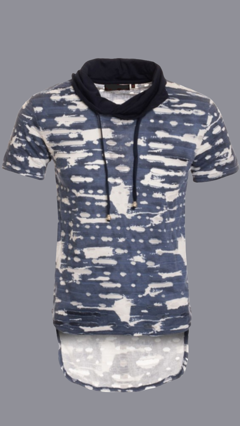 Unique look. Distressed look high/low shirt with a hoodie/t-shirt/sweater comfort style and the style and look of more stylishly artistic & contemporary wear. Cowl drawstring neckline. Ripped appear has cloth backing to prevent skin view from ripped areas. Spattered appearance gives a stylish dramatic affect. Modern fit.