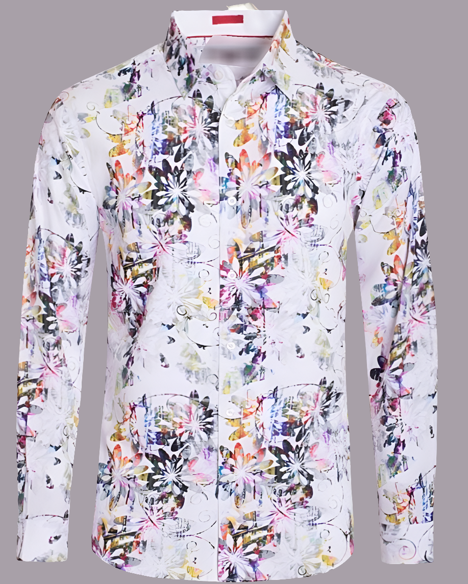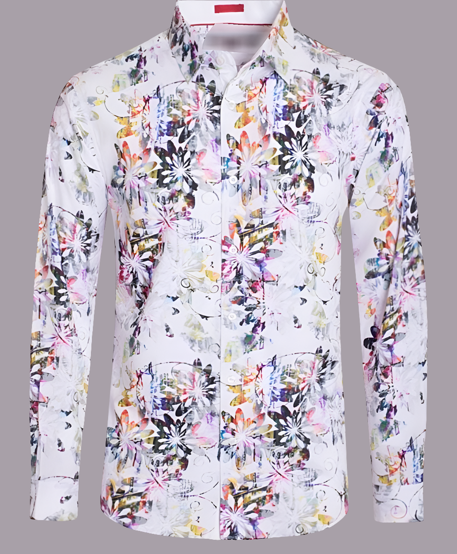 No ordinary shirt. Uniquely fresh, colorfully classy, and classic button shirt. *Durable, ultra smooth, comfortable, high quality fabric. Has light water color-like blooming colorful pattern design on it. Stylish and comfortable the look works well dressed up or down with jeans, khakis ,or a dress-slack smooth look.