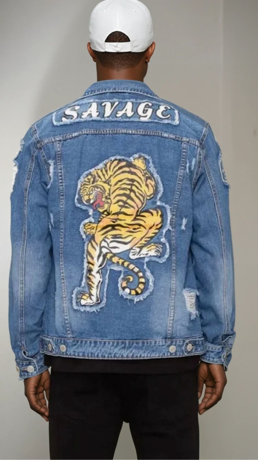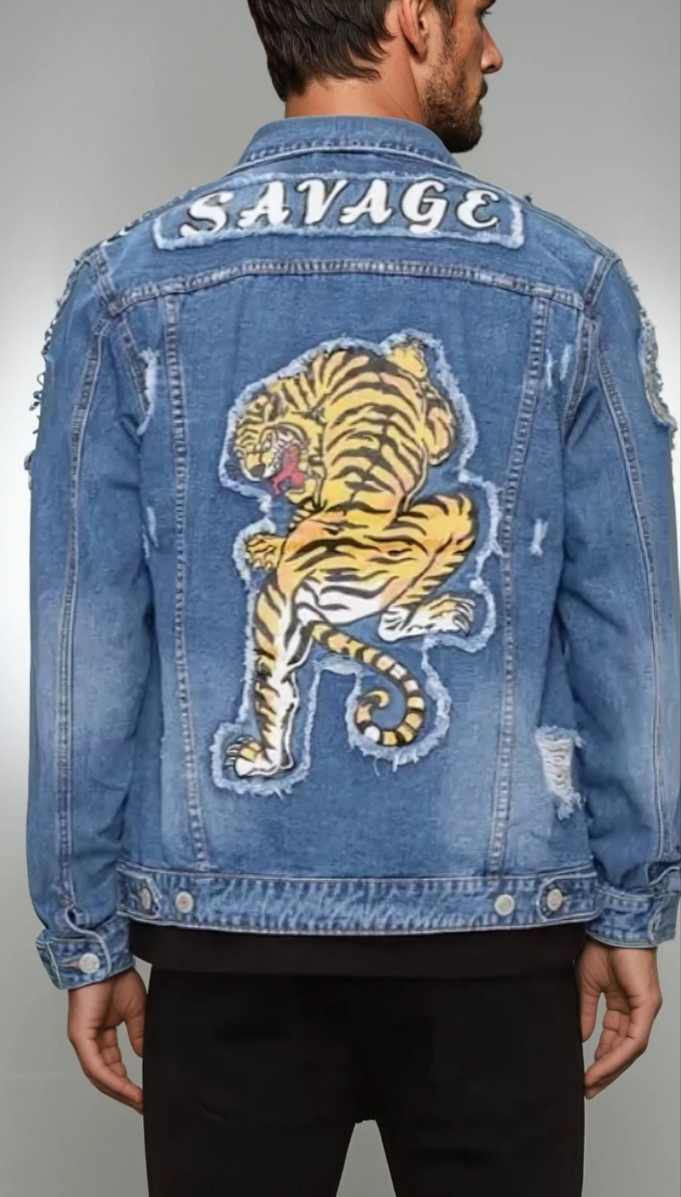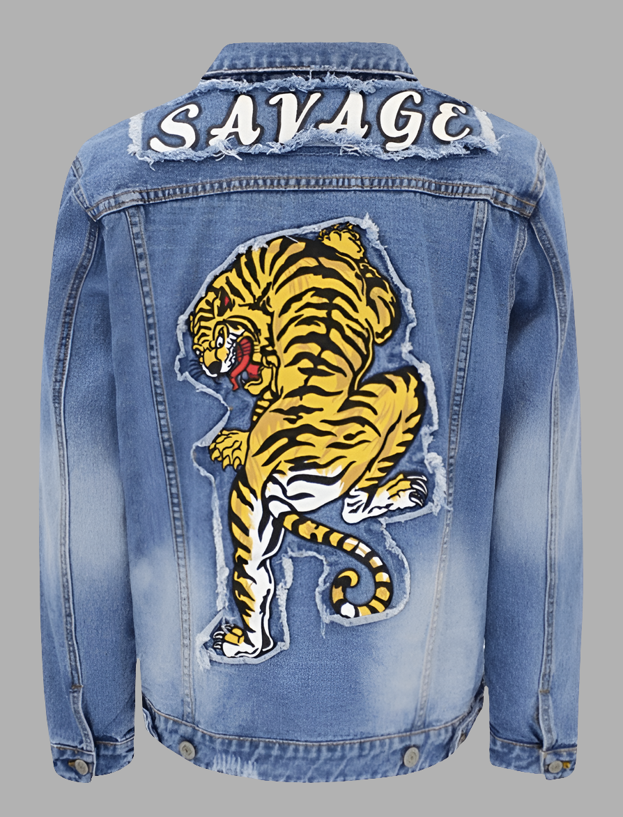 Denim button-down jacket with large words "Savage" on a ripped denim outline, stitched above a large tiger patch on the back. Stylishly functional swag dripped statement piece full of calm bold vibrance.