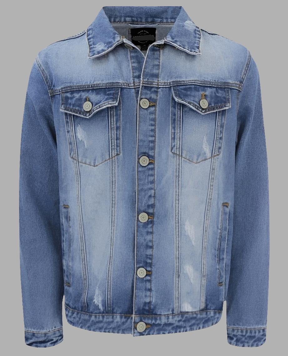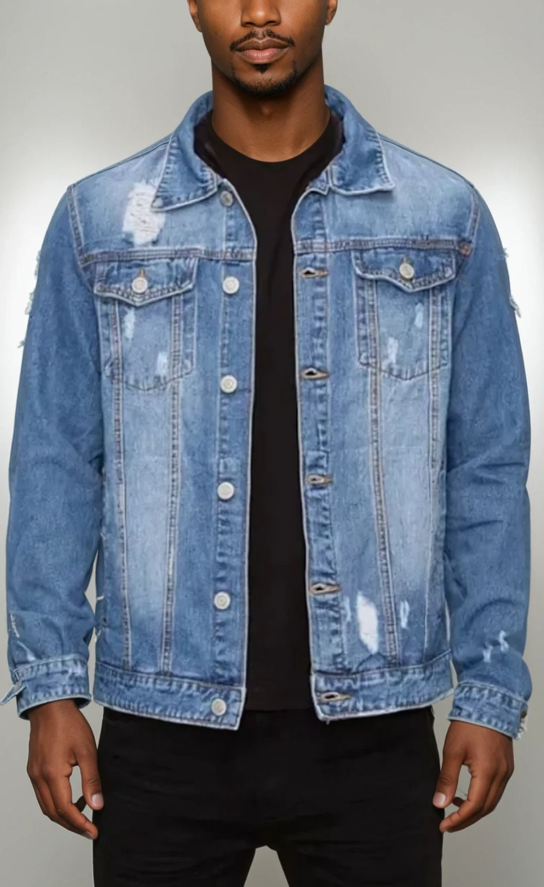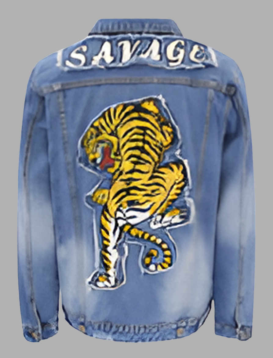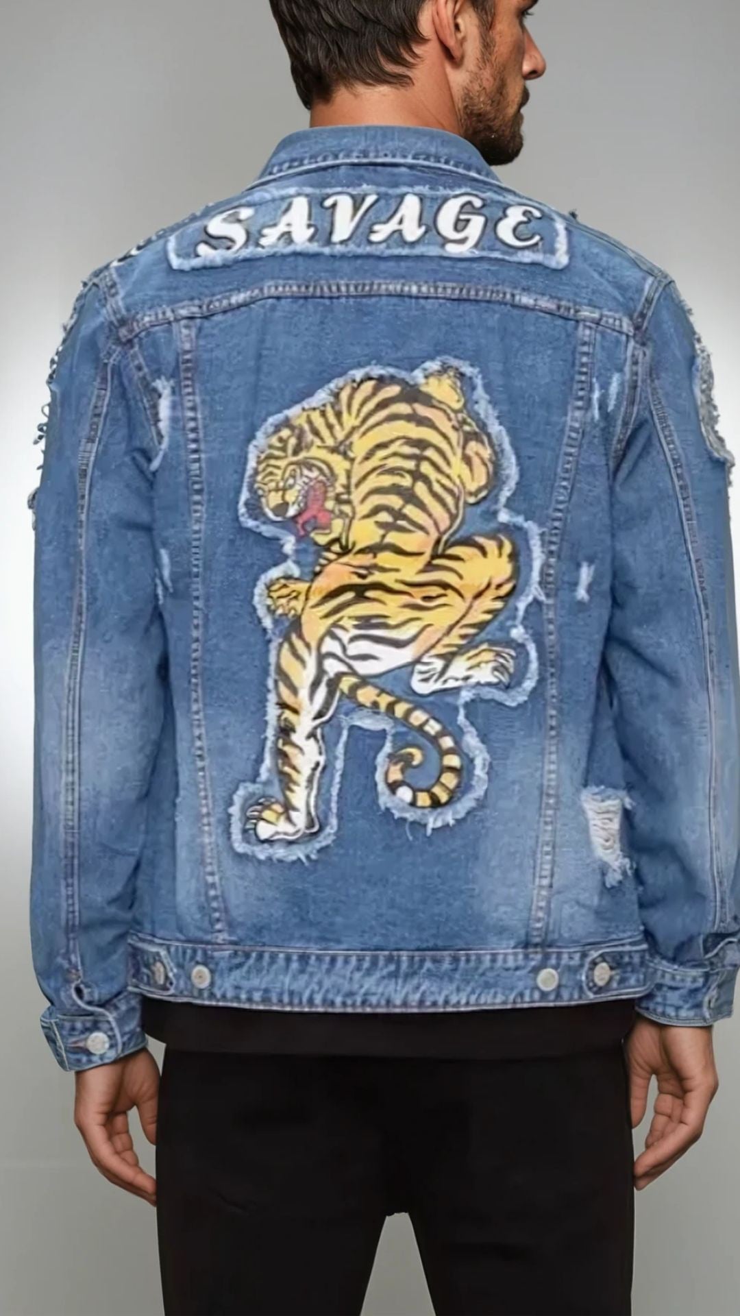 Denim button-down jacket with large words "Savage" on a ripped denim outline, stitched above a large tiger patch on the back. Stylishly functional swag dripped statement piece full of calm bold vibrance.