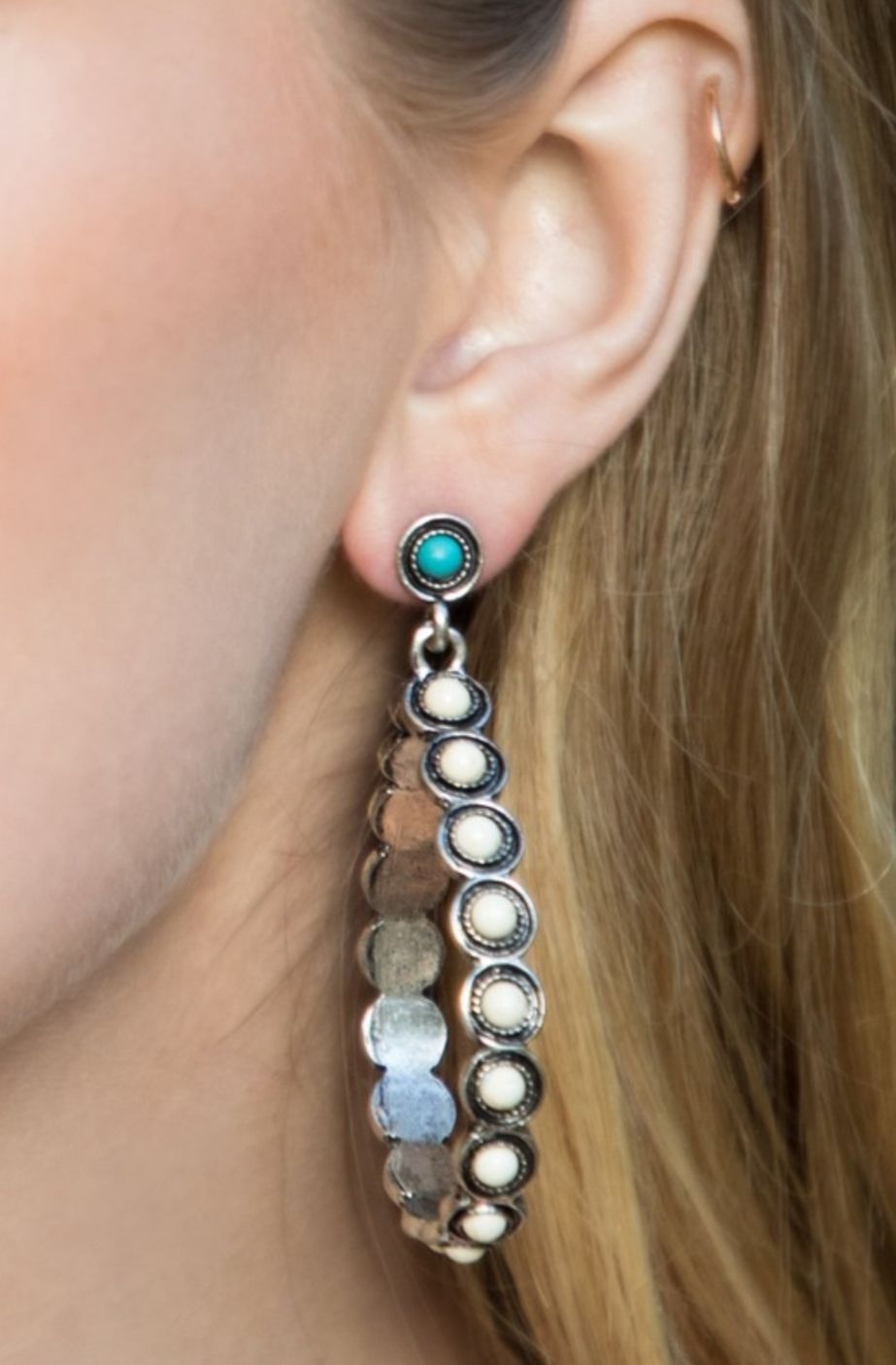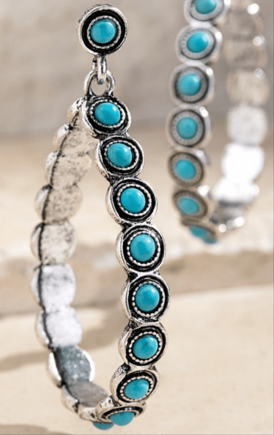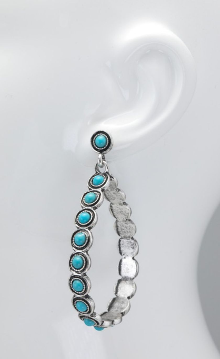 Turquoise(composite stone) stone brass earrings. Stones on thick brass metal dangling hoops. Dress up or down.