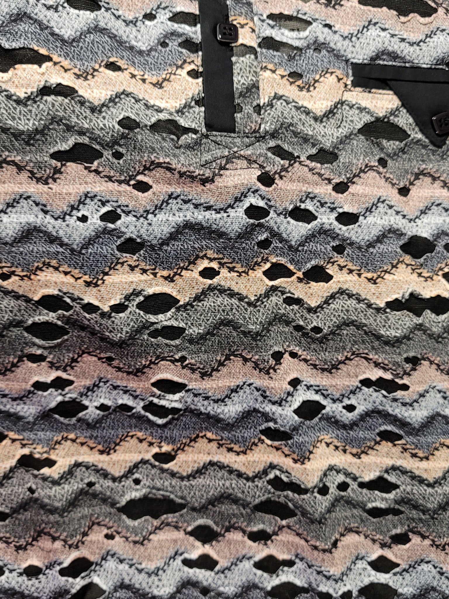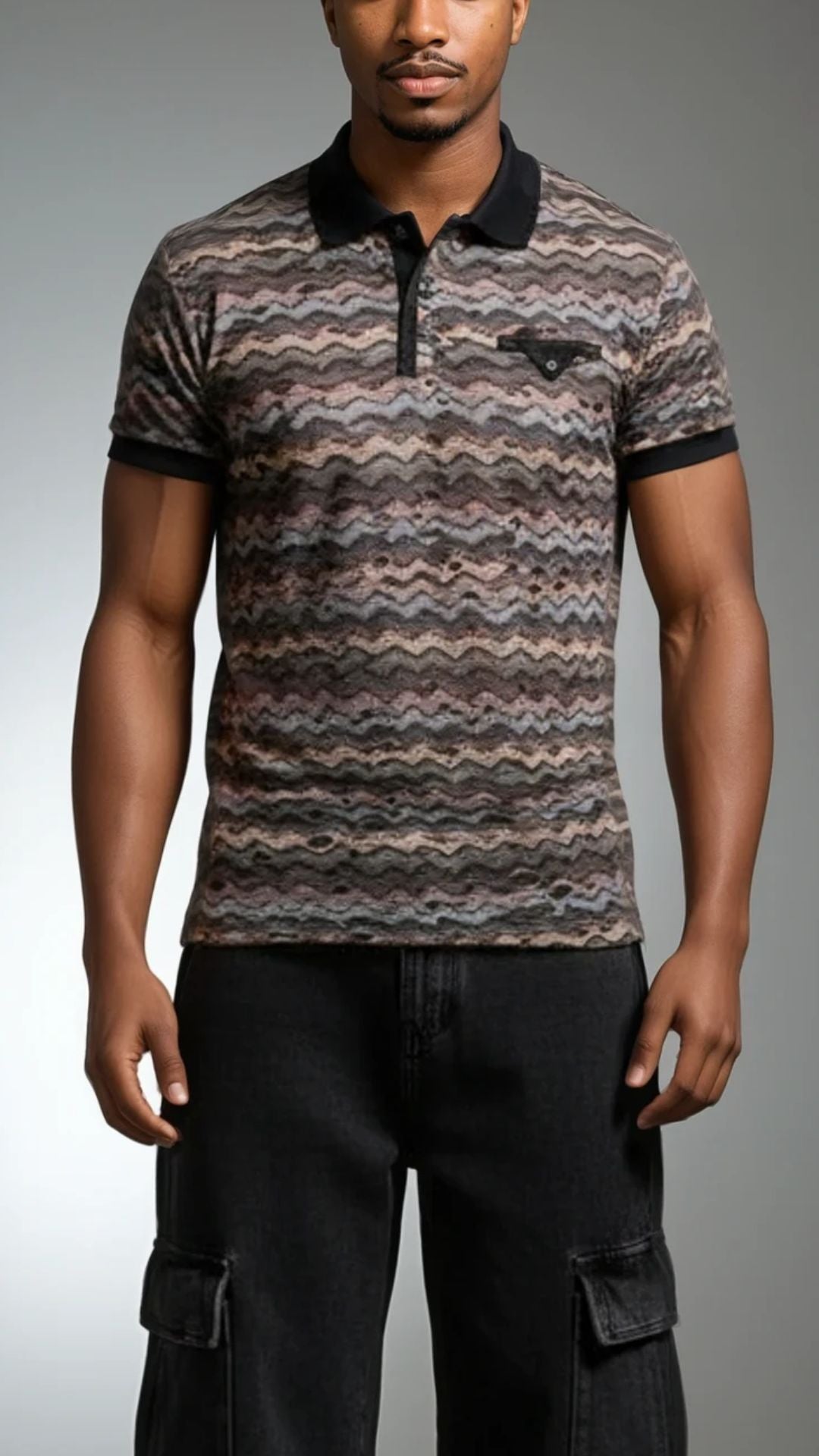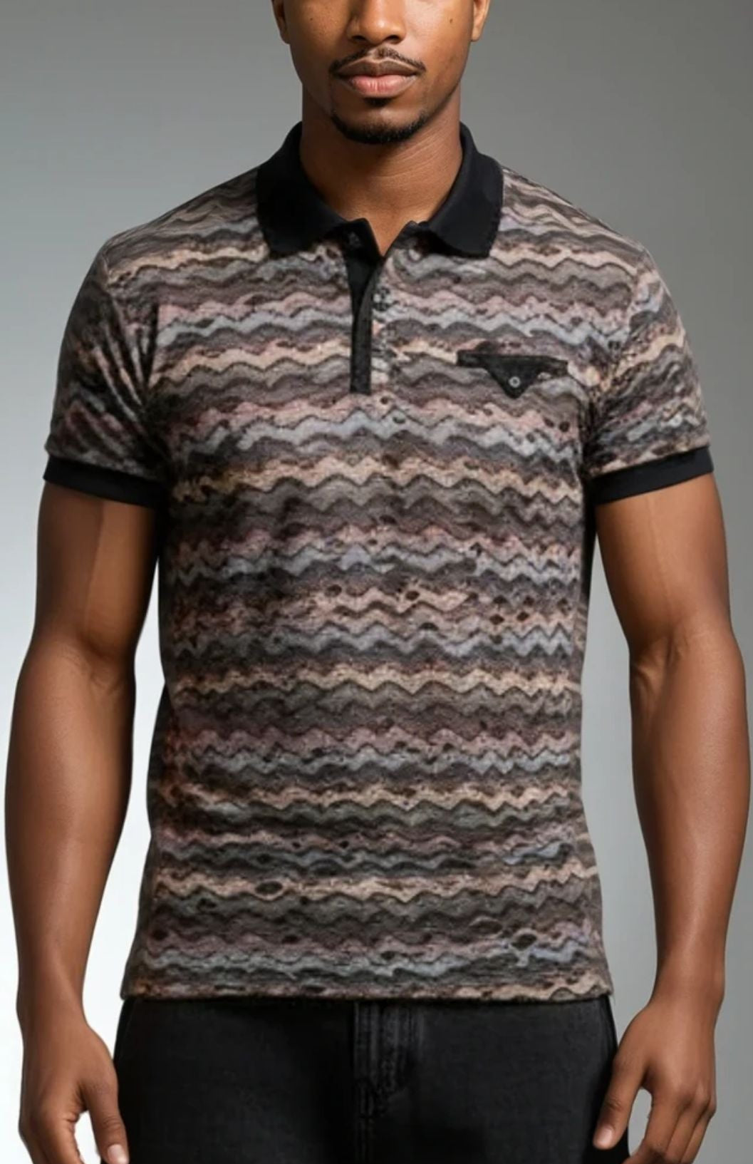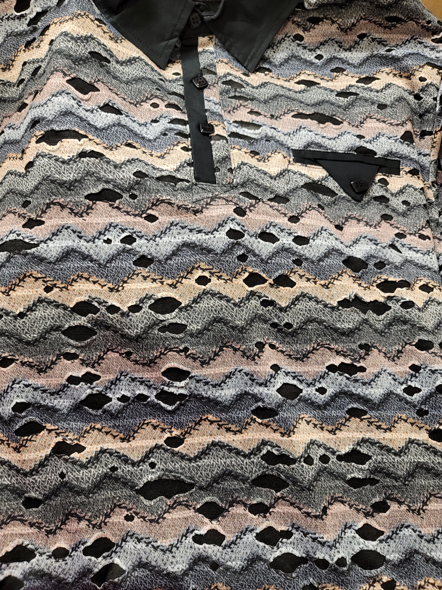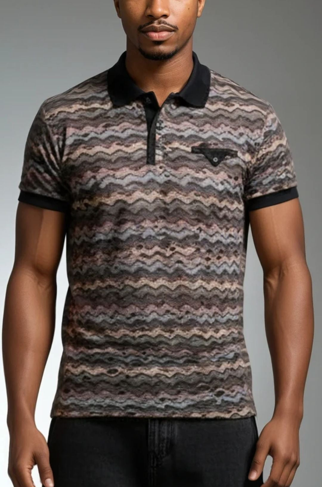 Men's distressed illusion, rough design fashion polo. Smooth fabric. Zig zag textured pattern.Multi natural tones and textured fabric that is a bit smooth and comfortable. Unique rough ripped/torn/distressed fabric style. *No portion of shirt is actually has any wearing that leads to wholes that show the skin through, due to another layer underneath. Multi natural tones and textured fabric that is a bit smooth and comfortable.Versatile and unique style.