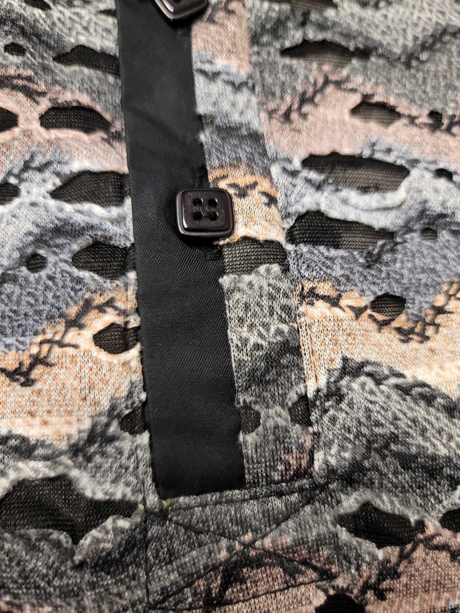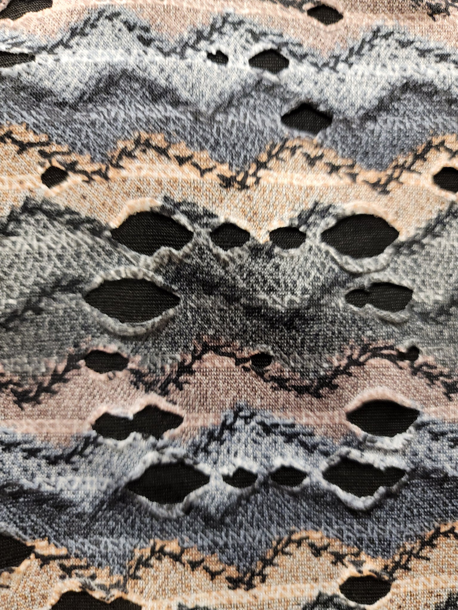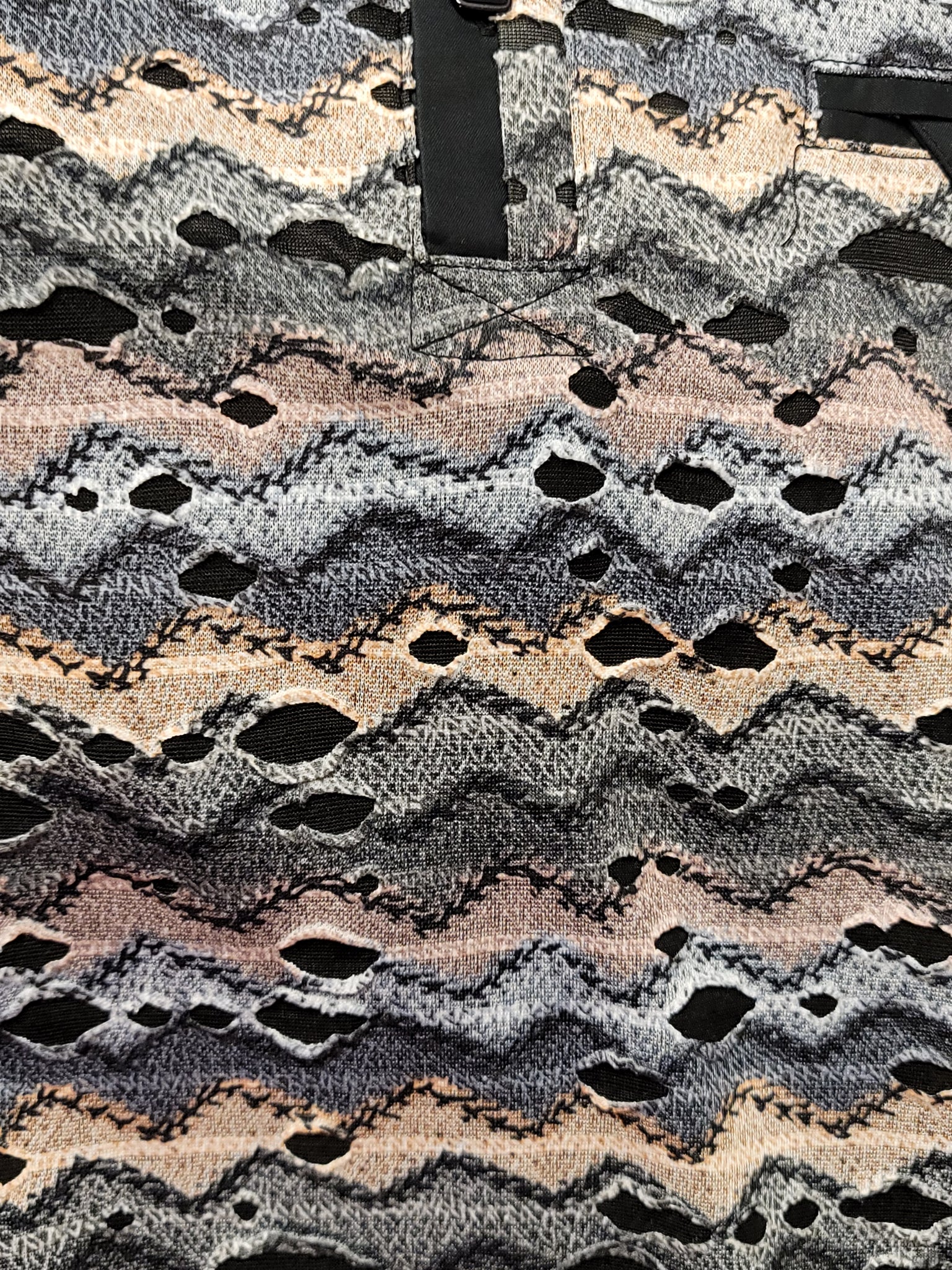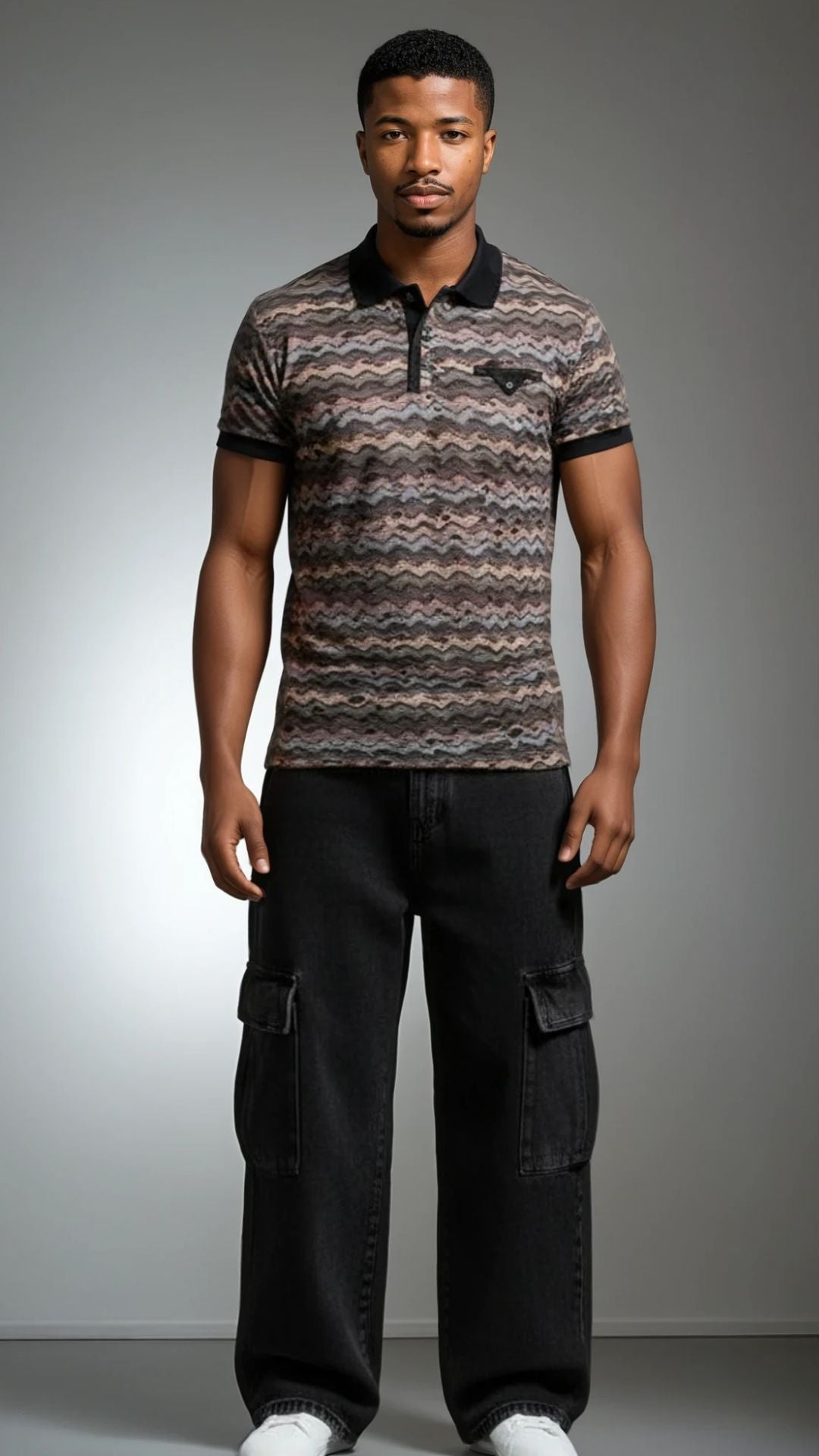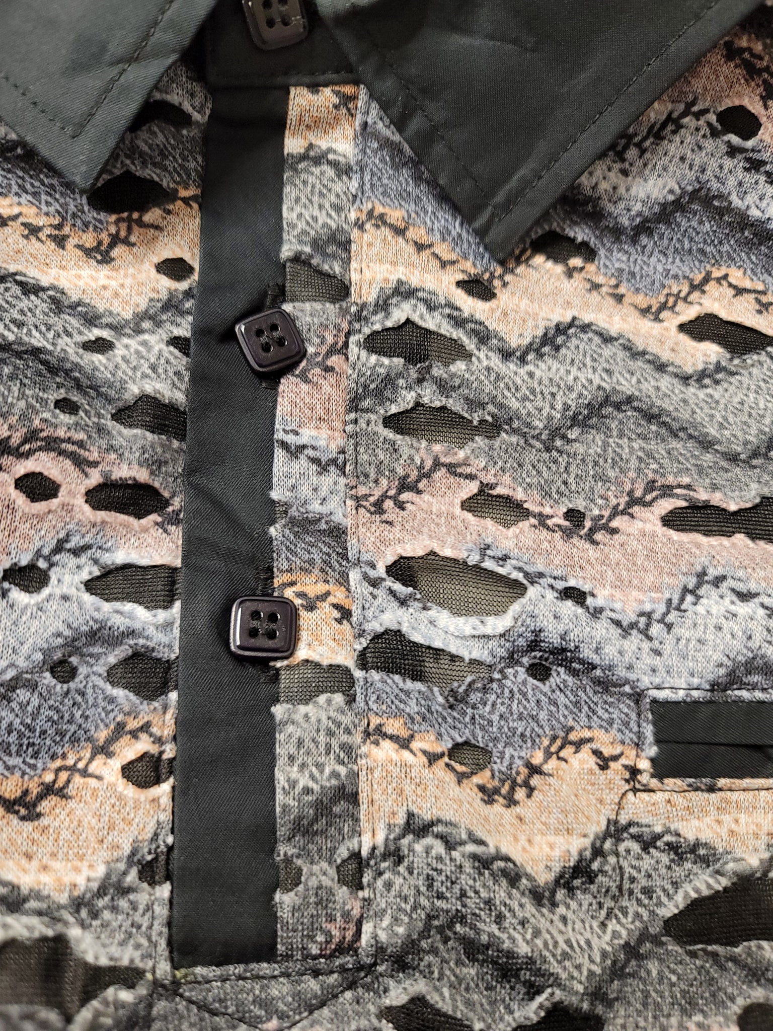 Men's distressed illusion, rough design fashion polo. Smooth fabric. Zig zag textured pattern.Multi natural tones and textured fabric that is a bit smooth and comfortable. Unique rough ripped/torn/distressed fabric style. *No portion of shirt is actually has any wearing that leads to wholes that show the skin through, due to another layer underneath. Multi natural tones and textured fabric that is a bit smooth and comfortable.Versatile and unique style.